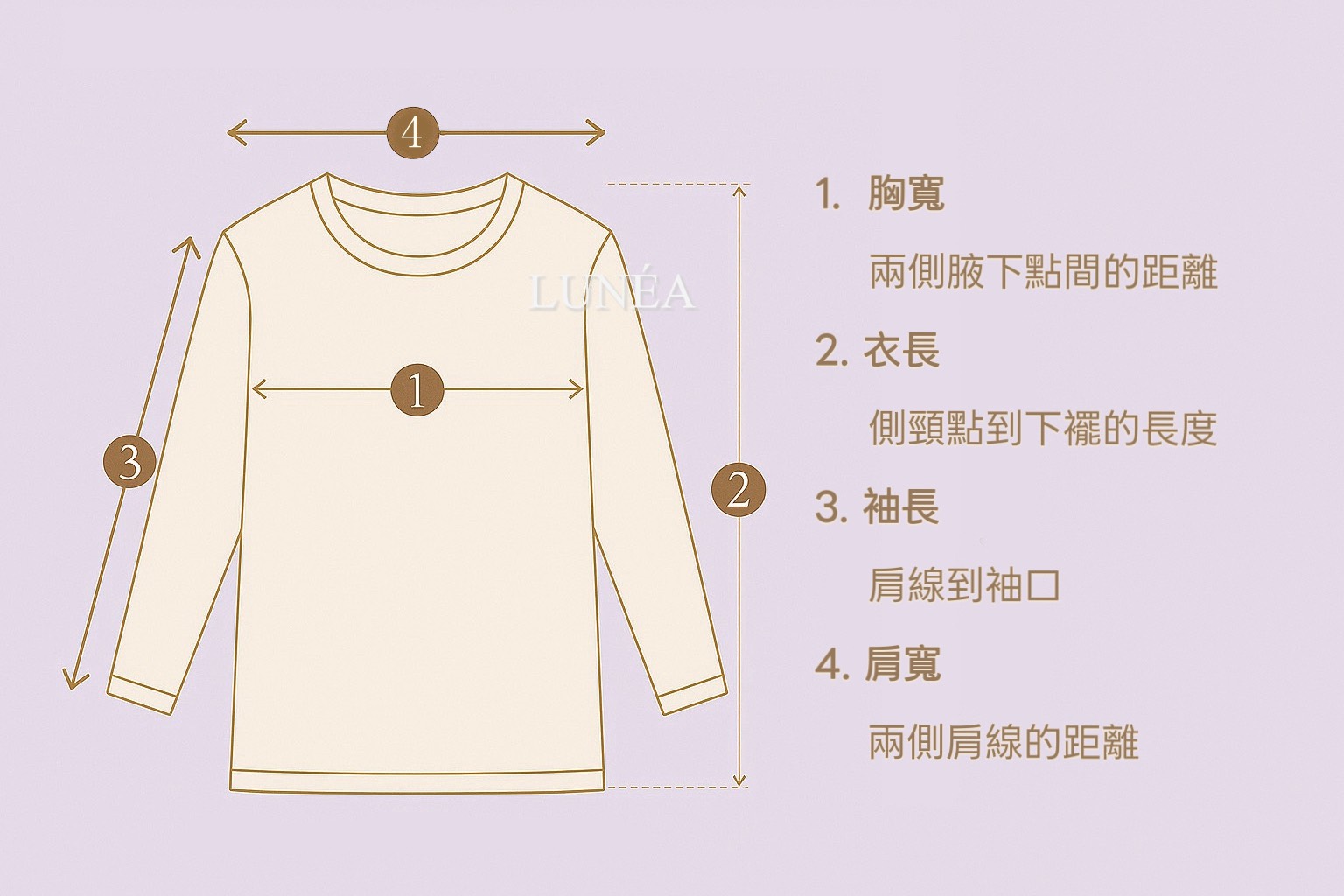 尺寸測量公告 親愛的顧客們: 為了讓大家更精準地選擇合適的尺寸, LUNÉA 所有商品的尺寸資訊,皆是依照 以下圖表的方式進行「手工平放測量」 後所製作。 提醒您: • 每件商品因布料特性及人工測量方式不同,可能會有 1–3 公分誤差,屬正常範圍。 • 若遇針織或彈性布料,數據僅供參考,實際穿著時會依個人身形及布料彈性有所不同。 感謝您的理解與支持,祝大家購物愉快