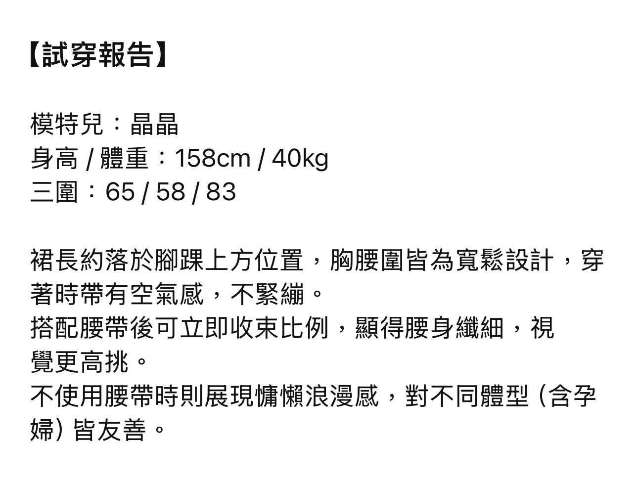這件長裙本身寬鬆包容,對各種體型皆友善,