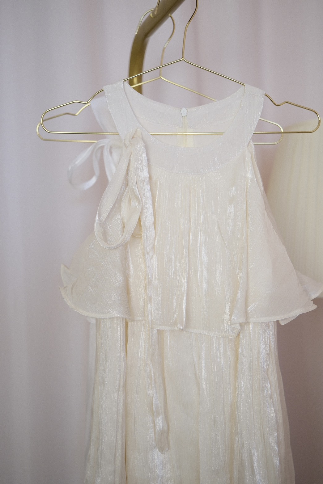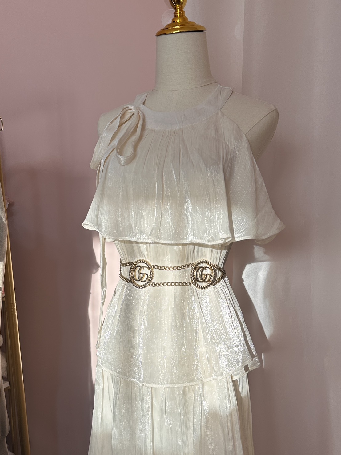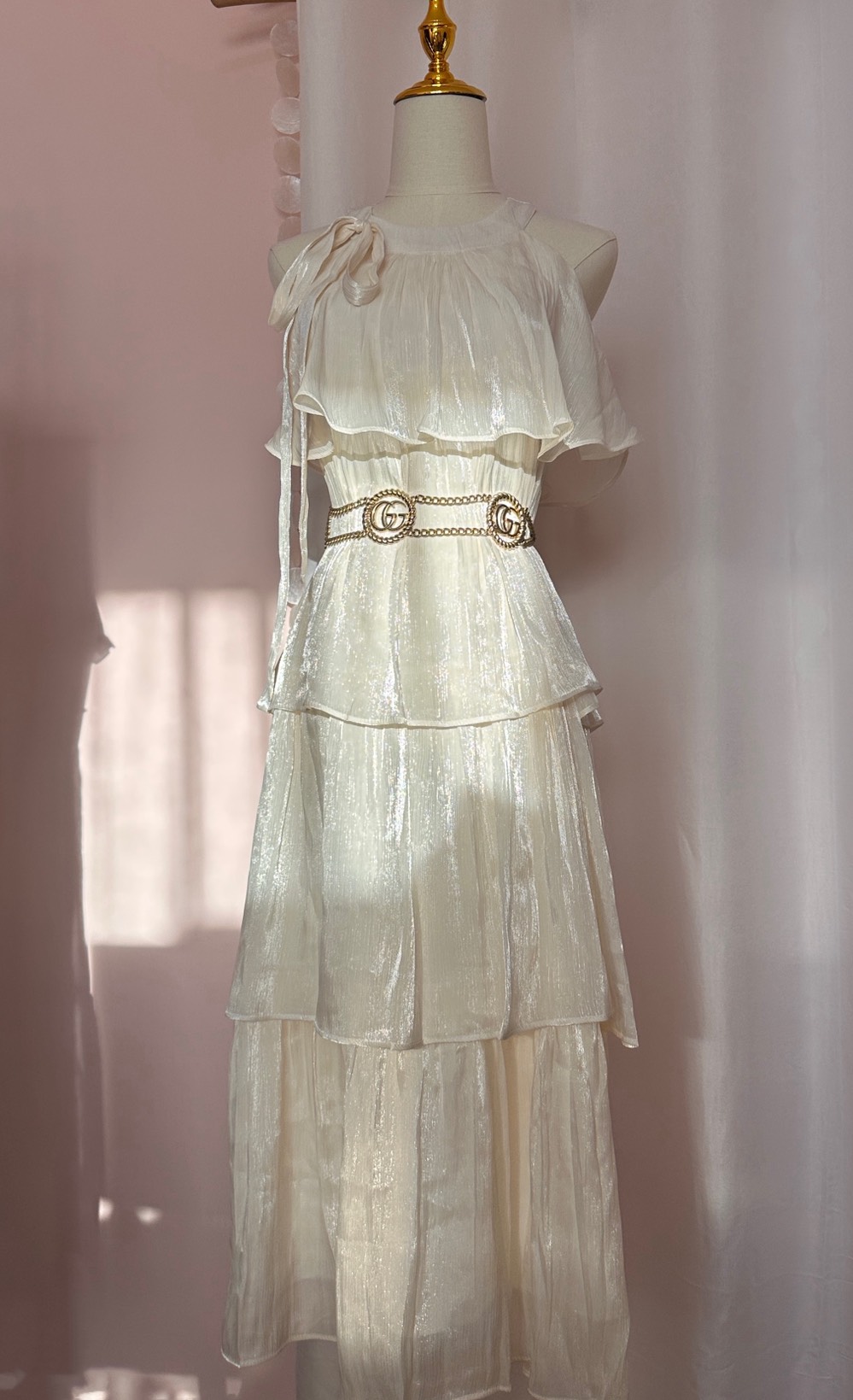 裙身為連身設計,布料在光線下散發自然珍珠光澤,