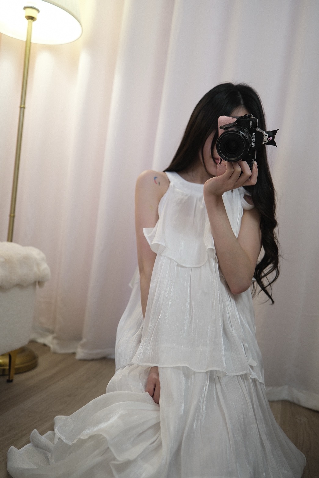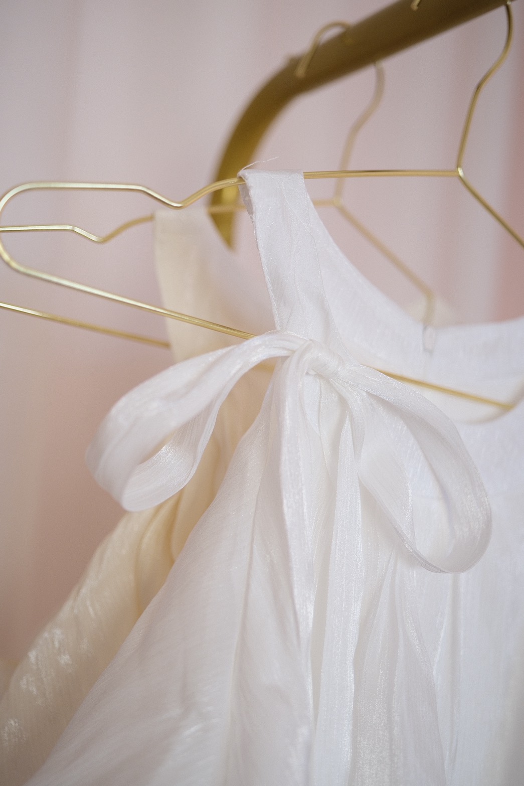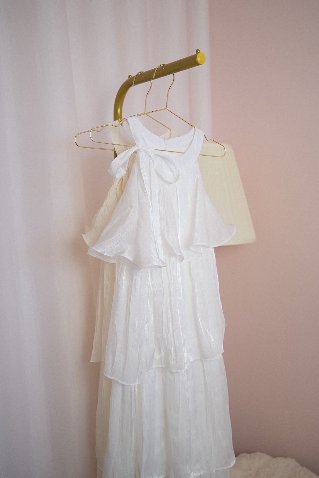 裙身為連身設計,布料在光線下散發自然珍珠光澤,