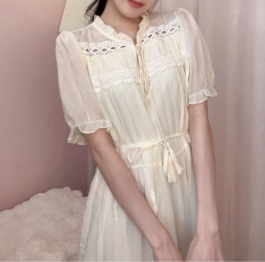 裙身以 蕾絲拼接與細緻抽皺設計 打造層次感,