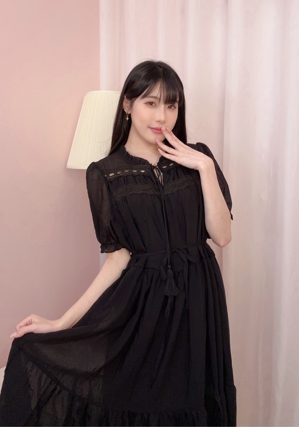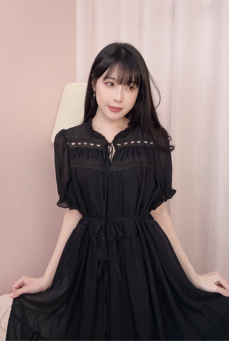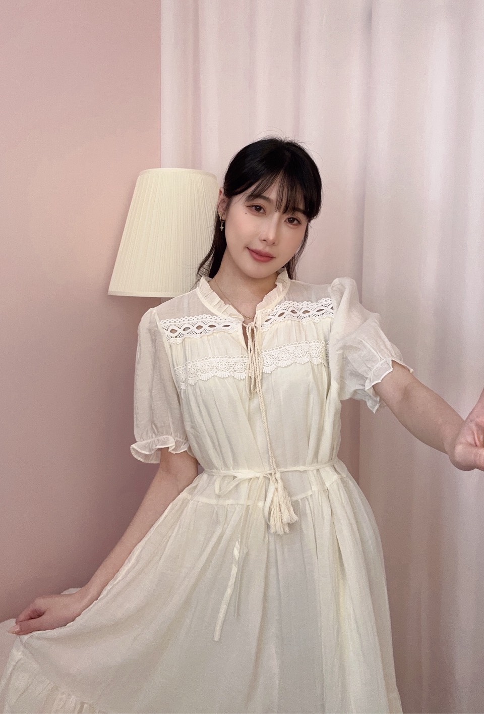 上身搭配蝴蝶結綁帶與鏤空細節,增添溫柔小巧思。