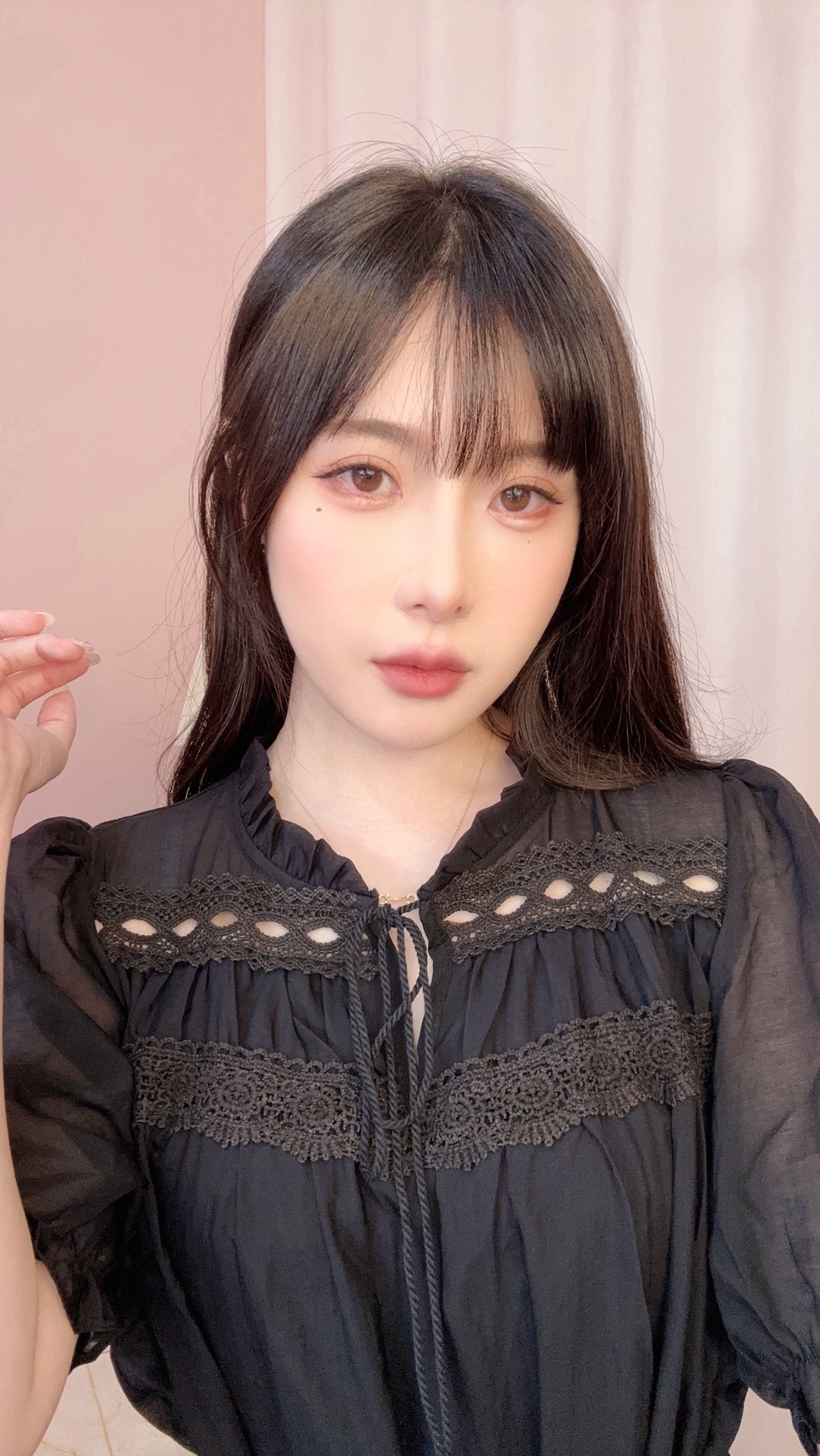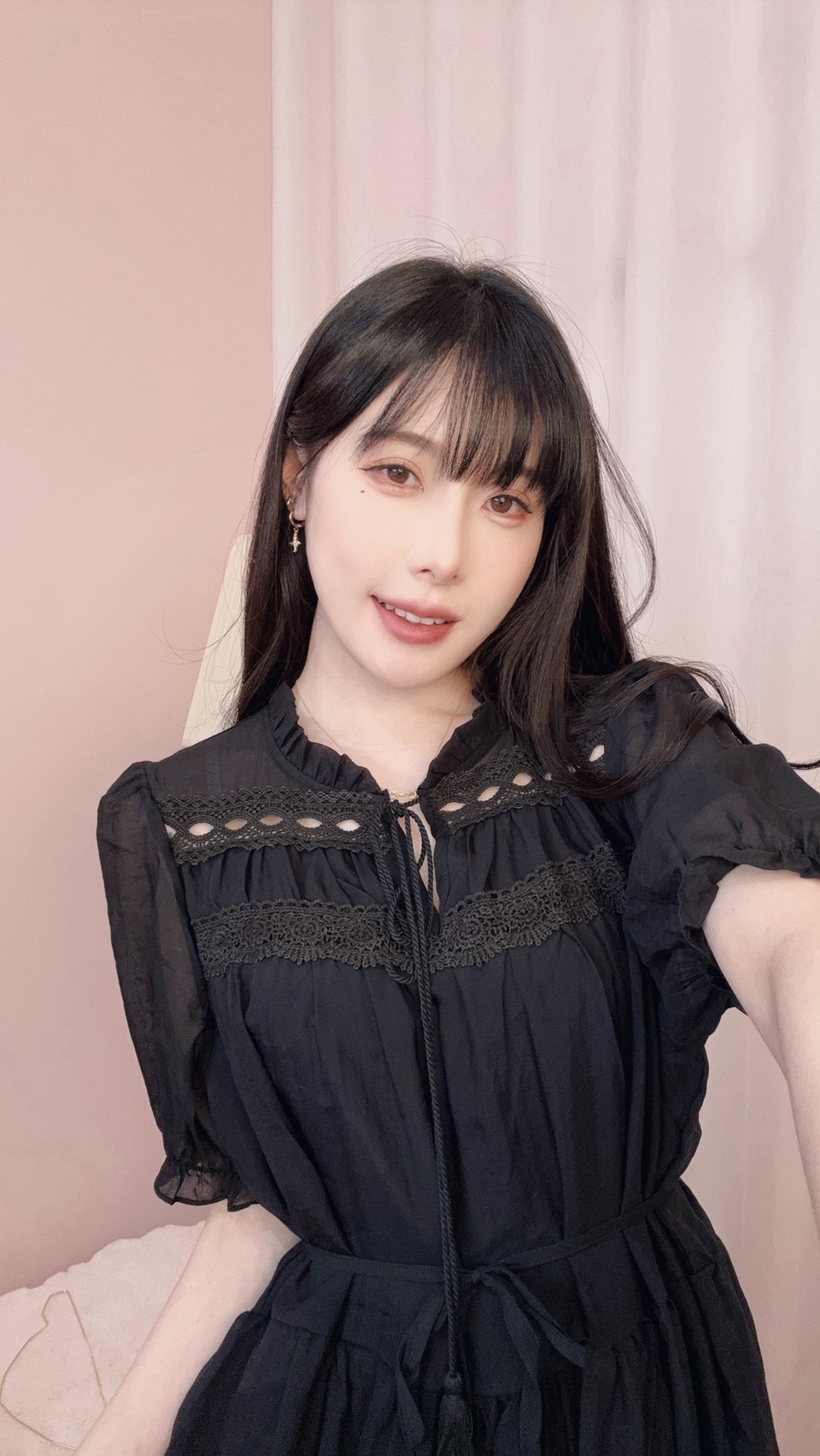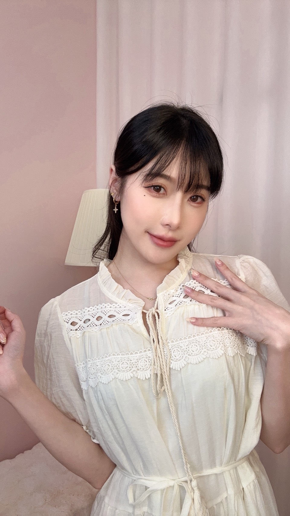 上身搭配蝴蝶結綁帶與鏤空細節,增添溫柔小巧思。